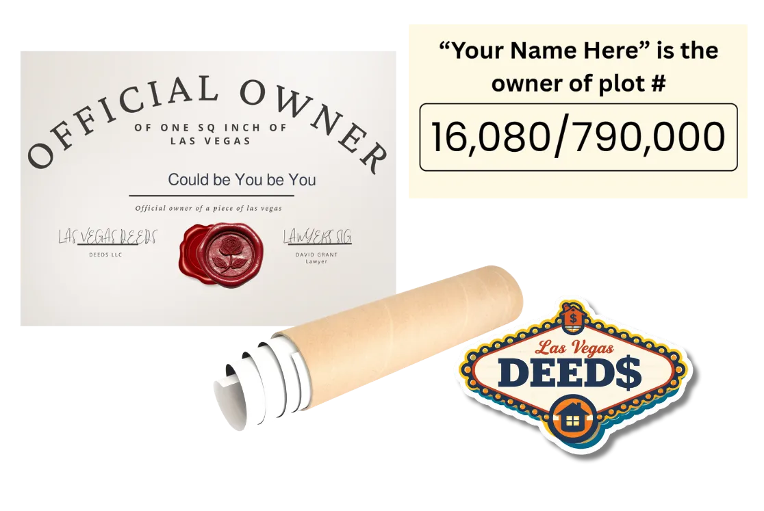 Own a legally notarized deed to one square inch of authentic Las Vegas land—personalized in your name and shipped to you. It’s the ultimate Vegas souvenir: unique, recordable, and only $20.